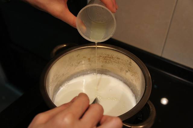 鮮奶溫度...我沒有溫度計,所以把鮮奶邊加熱邊攪拌一直到用湯匙沾鍋中的