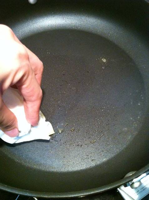 平底鍋先加入少許的油,再用廚房紙巾擦拭多餘的油