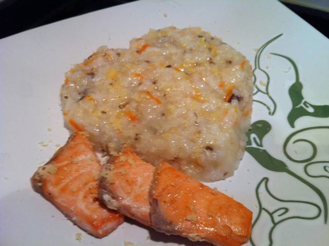 將燉飯與鮭魚裝盤,研磨器加入[高達起司]完成